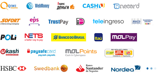 (Yandex.Money,WebMoney,UPI,UnionPay,QIWI,Paytm,GCash,E-Banking,Dotpay,DOKU,Boleto,Alfamart,European bank transfer,Credit/Bank Card,ATM, 200+ payment methods worldwide)